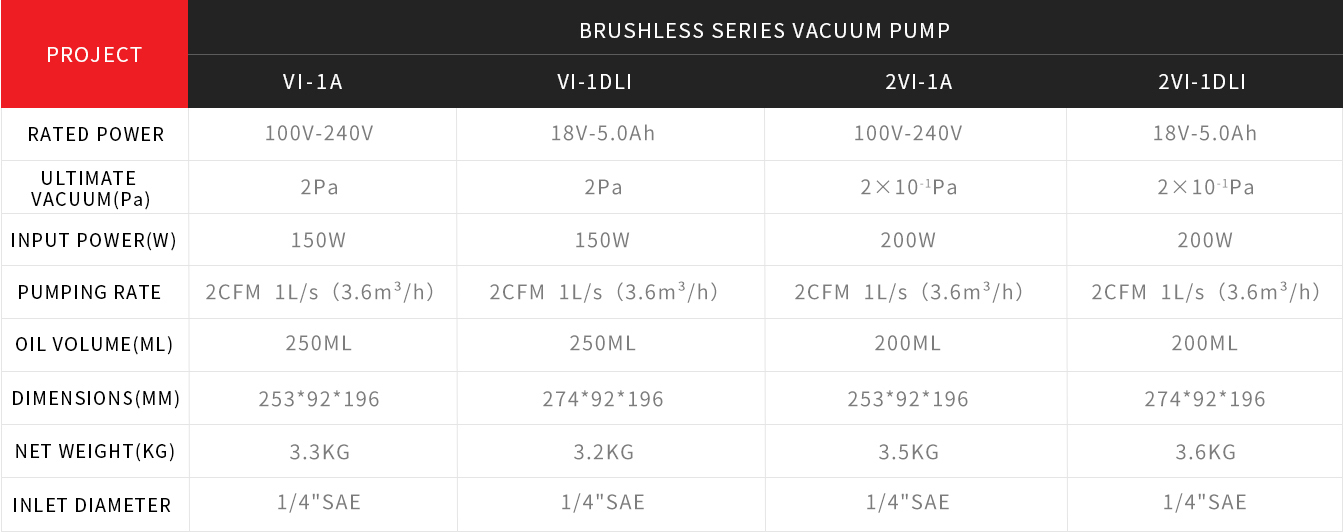 Integral cylinder structure design improves ultimate vacuum and pumping rate Forced oil pump lubrication to ensure reliability Using brushless DC motor, non-sparking design, lighter, smaller and more convenient Use lithium battery, safer and more convenient to use